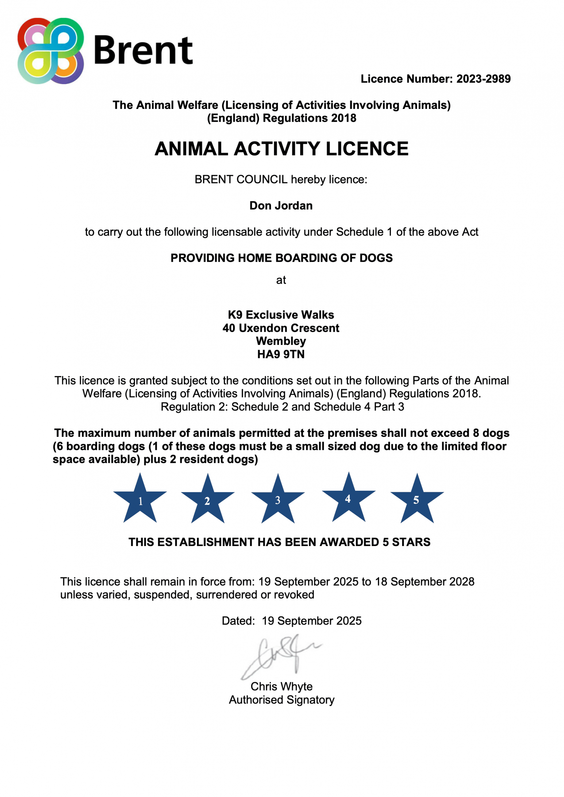 - Home Boarding in London: Inclusive of daily walks and a 350ft secure private garden for safe playtime.